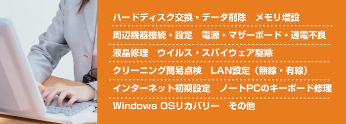| ●パソコンの動作が非常に遅い。 | メモリ増設、ハードディスク(SSD)交換、ウイルス(マルウェア)駆除 |